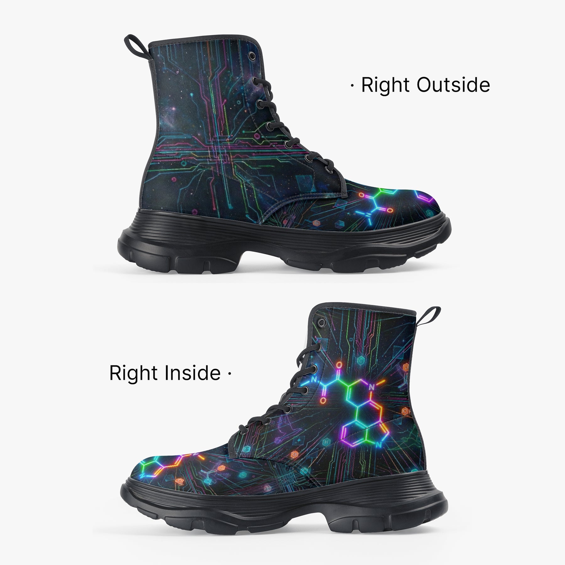 Our iconic, custom-made boots are designed to stand out while delivering exceptional quality and comfort. Made from 100% vegan leather, they’re stylish, durable, and perfect for any occasion, any season, and any outfit. Featuring a double-sided vibrant print, a lace-up closure for a secure fit, and a soft textile lining for maximum comfort, these boots are as practical as they are eye-catching. The high-quality rubber outsole with a steel shank ensures durability and traction, while the removable insole allows for a personalized fit. Designed true to size, they accommodate wider feet with ease. Every pair is handcrafted to the highest standards, made just for you.