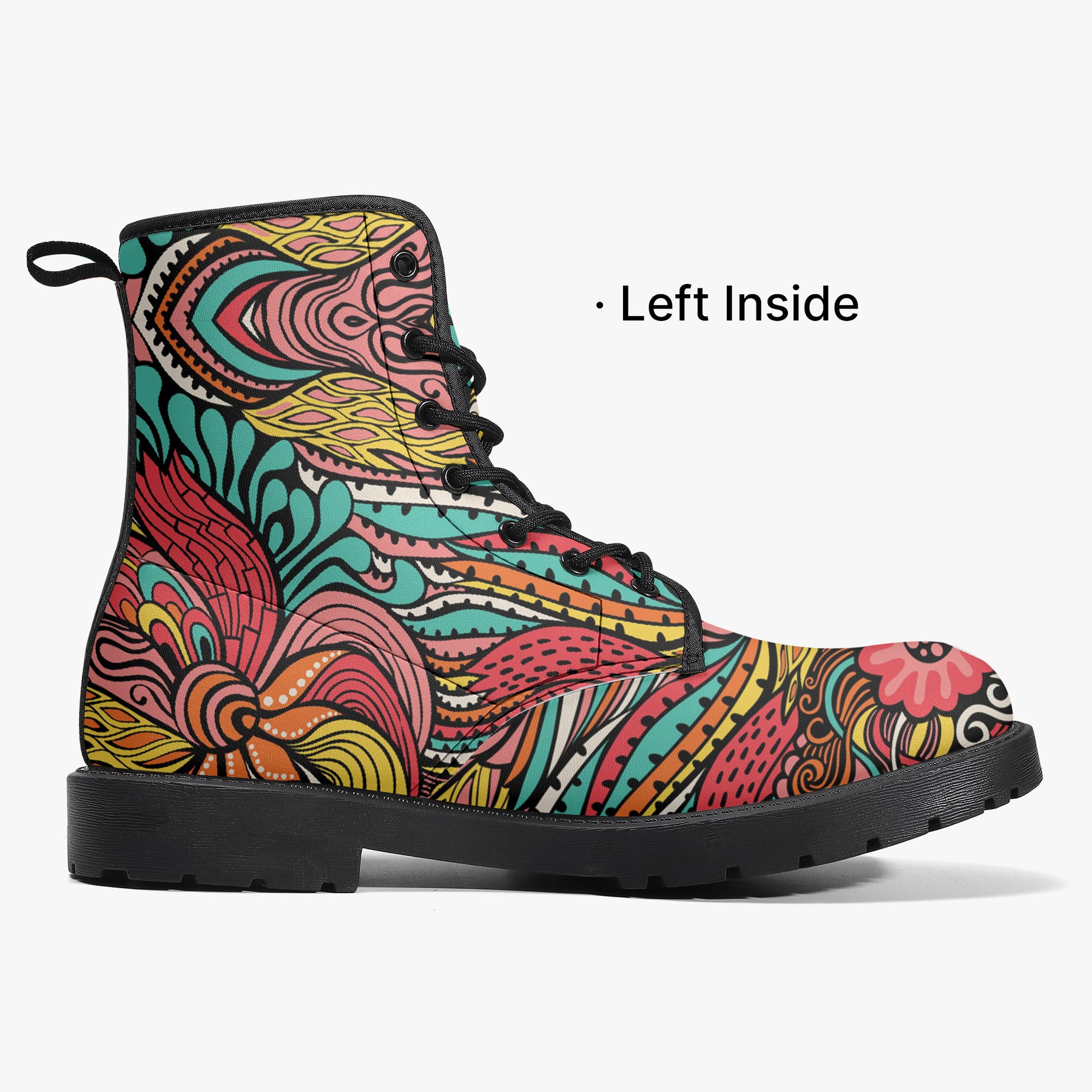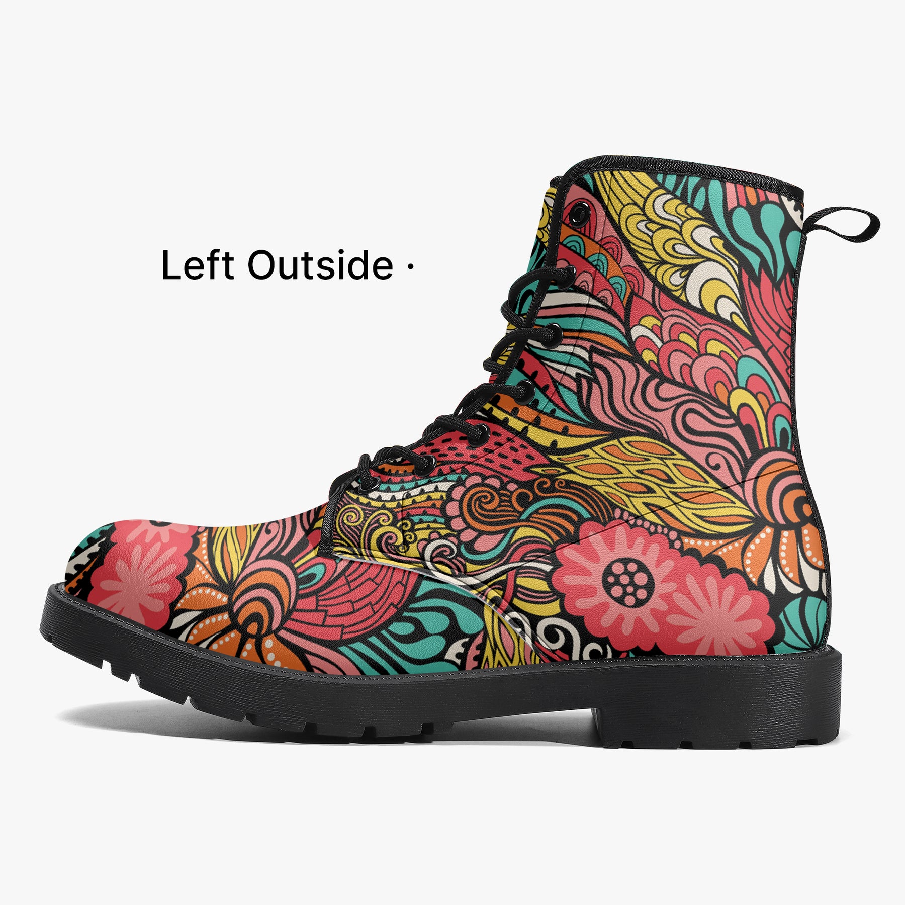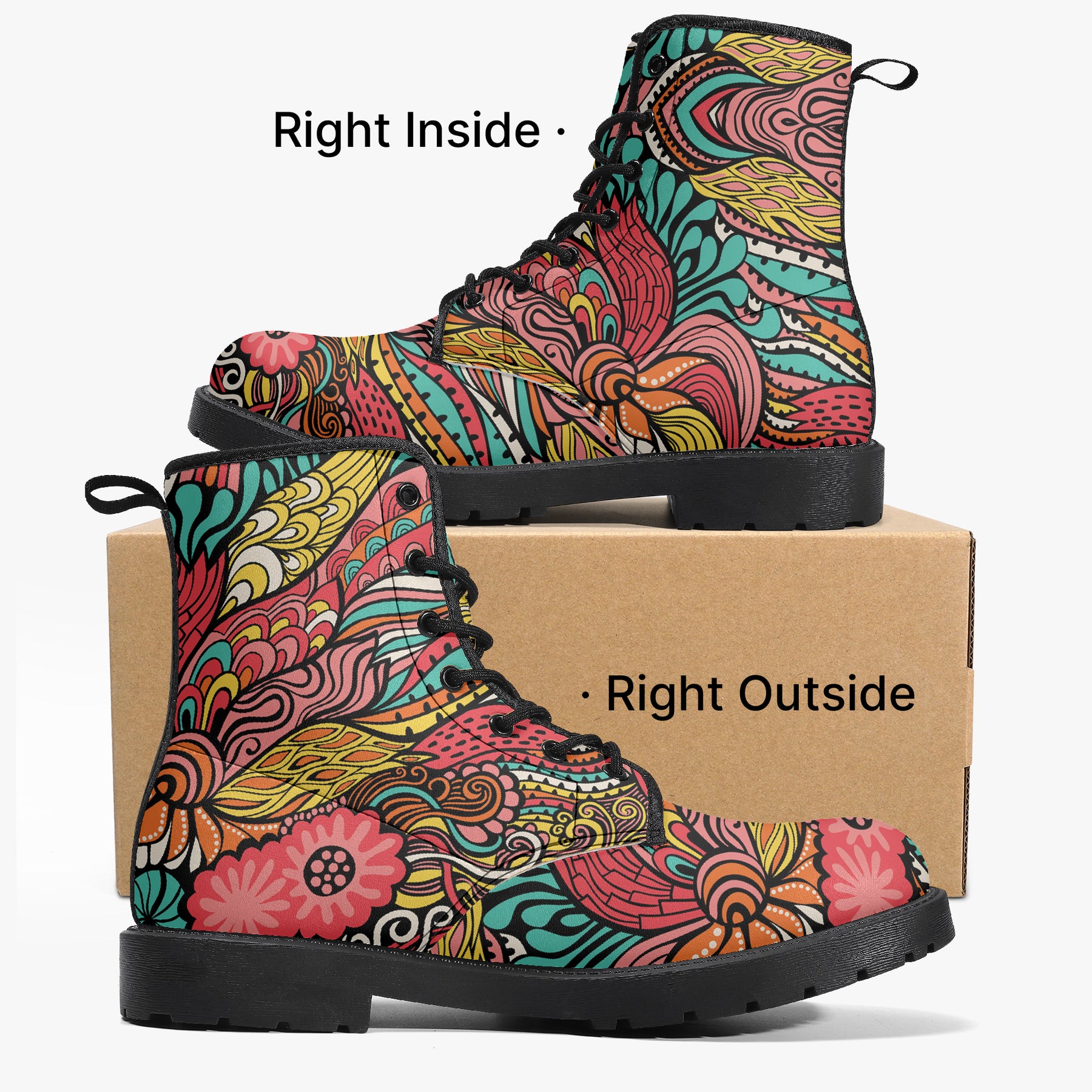 Our iconic, custom-made boots are designed to stand out while delivering exceptional quality and comfort. Made from 100% vegan leather, they’re stylish, durable, and perfect for any occasion, any season, and any outfit. Featuring a double-sided vibrant print, a lace-up closure for a secure fit, and a soft textile lining for maximum comfort, these boots are as practical as they are eye-catching. The high-quality rubber outsole with a steel shank ensures durability and traction, while the removable insole allows for a personalized fit. Designed true to size, they accommodate wider feet with ease. Every pair is handcrafted to the highest standards, made just for you.